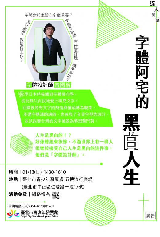 臺北市青少年發展處1月13日舉辦達人開講「字體阿宅的黑白人生」,邀請參與金萱字型開發的字體設