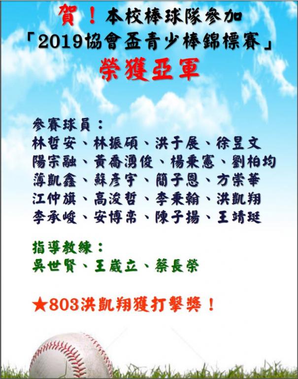 賀!本校棒球隊參加「2019協會盃青少棒錦標賽」榮獲亞軍