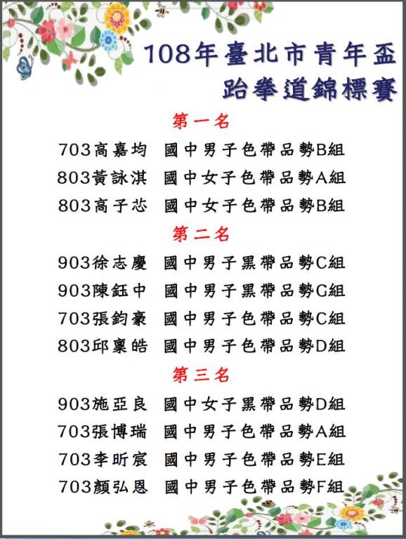 賀!本校跆拳道隊參加108年臺北市青年盃勇奪佳績!