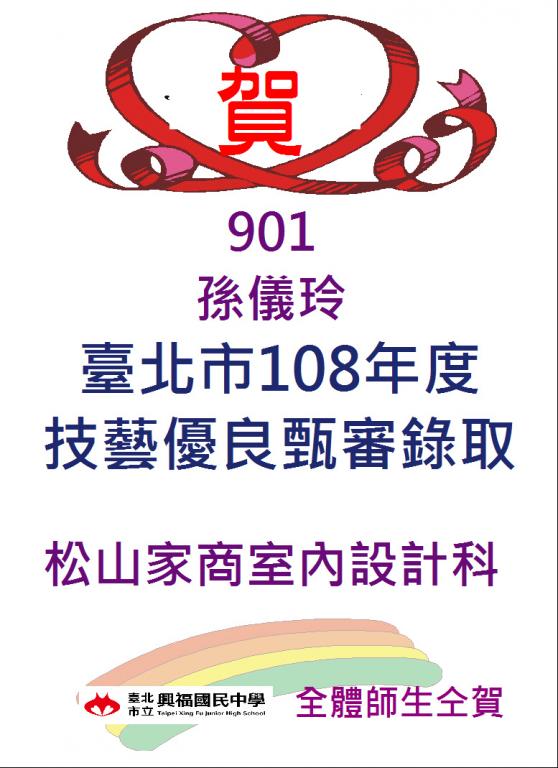 » 狂賀本校901孫儀玲錄取108年度技優甄審松山家商室內設計科