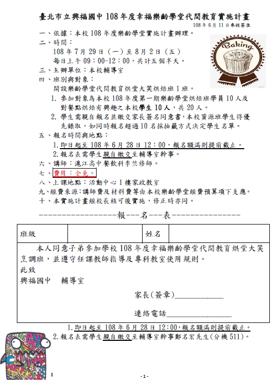 臺北市立興福國中108年度暑期樂齡代間烘焙課程~~免費參與